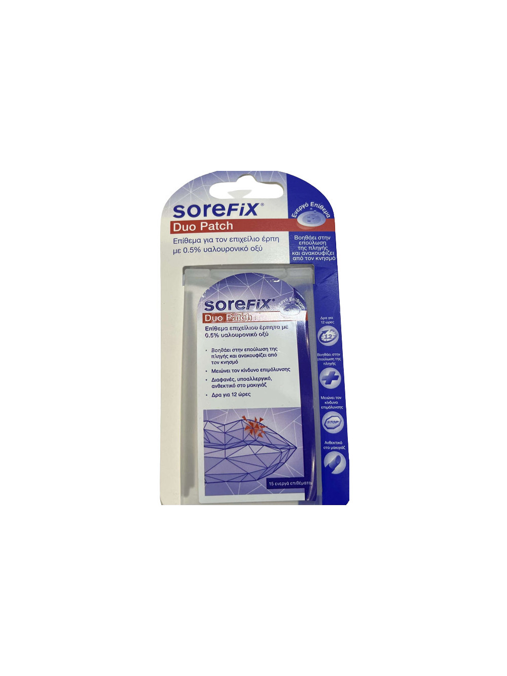 Το SoreFix Duo Patch είναι το πρώτο και μοναδικό διαφανές επίθεμα με συστατικό επούλωσης πληγών. Είναι ένα εξαιρετικά λεπτό, διαφανές, υποαλλεργικό επίθεμα που προσκολλάται στο χείλος.
