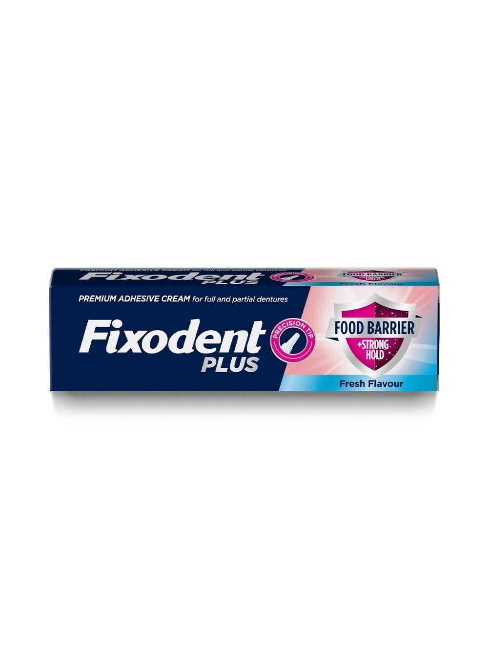 Η στερεωτική κρέμα Fixodent Plus Aσπίδα κατά των τροφών με γεύση μέντας βοηθά στην αποτροπή εισχώρησης υπολειμμάτων τροφής στην οδοντοστοιχία.